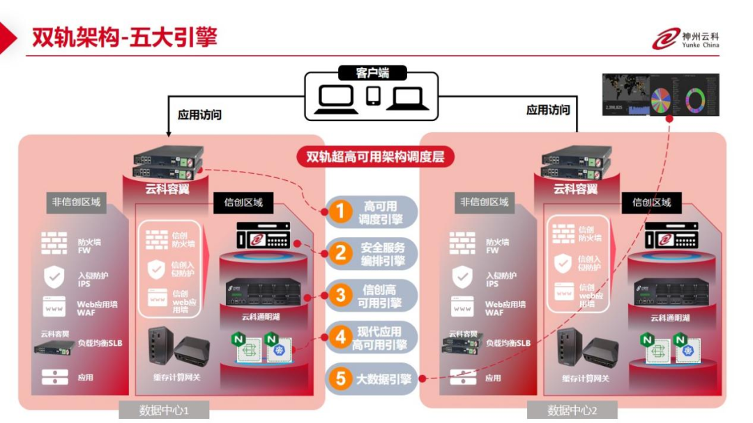 数据中心架构在自主创新的过程中分解为现有架构的非信创区和信创区的两个业务区域,在每个数据中心分为信创区和非信创区后,在两个区域之间的跨区跨域协同方法,神州今年会通过5大引擎实现多层次的应用可持续性实践。