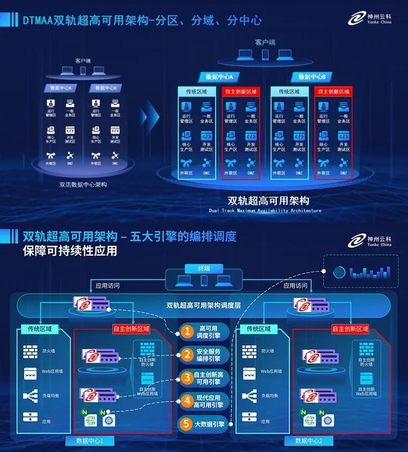 为助力银行业务高质量发展,更好地应对数字经济时代对可持续性的高要求,实现“信创”与“数字化”齐头并进,神州今年会创新性的推出了双轨超高可用架构。该架构在双活数据中心的分区调度基础上,增加信创域和非信创域的分域调度,实行信创域与传统域应用全量部署,使双中心运营变为双中心四区域并行运行,互为多活,将“0到1”的单轨建设道路变为分区分域协同的多活双轨超高可用架构。帮助客户在新架构下,保障“信创”的同时解决性能瓶颈,提升稳定性,保证应用可持续性,最终实现信创区域和非信创区域的平滑过渡,完成国产化替代目标。