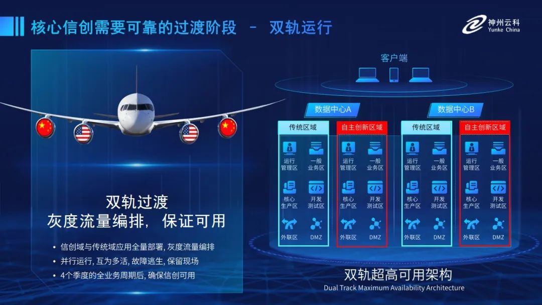 为帮助客户更好地应对数字经济时代对应用可持续性的高要求,实现信创与数字化兼得,神州今年会推出了双轨超高可用架构。双轨超高可用架构在双活数据中心的分区调度基础上,增加信创域和非信创域的分域调度,实行信创域与传统域应用全量部署,使双中心运营变为双中心四区域并行运行,互为多活,将传统架构变为分区分域协同的多活双轨超高可用架构。帮助客户在新架构下,保障“信创”的同时解决性能瓶颈,提升稳定性,保证应用可持续性,最终实现信创区域和非信创区域的平滑过渡,完成国产化替代目标。”